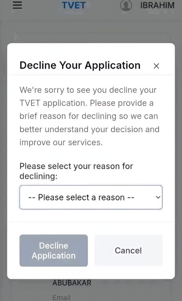So as a Trainee, when you decline your TVET Application even with a concrete reason. You will be placed on hold until all candidates who were not approved to be approved or rejected first. Before you will be given another opportunity to be matched to another training center again.